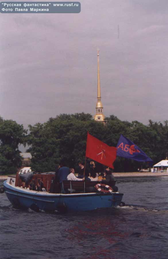 "А вот и Петропавловка". Катер с финалистами входит в Кронверкский пролив. "В ожидании катера". Слева направо - финалисты Вячеслав Рыбаков и Михаил Веллер и член Оргкомитета Андрей Измайлов в Белом зале ЦСЛиК. "Приплыли!". Святослав Логинов со знаменем "АБС-премии".