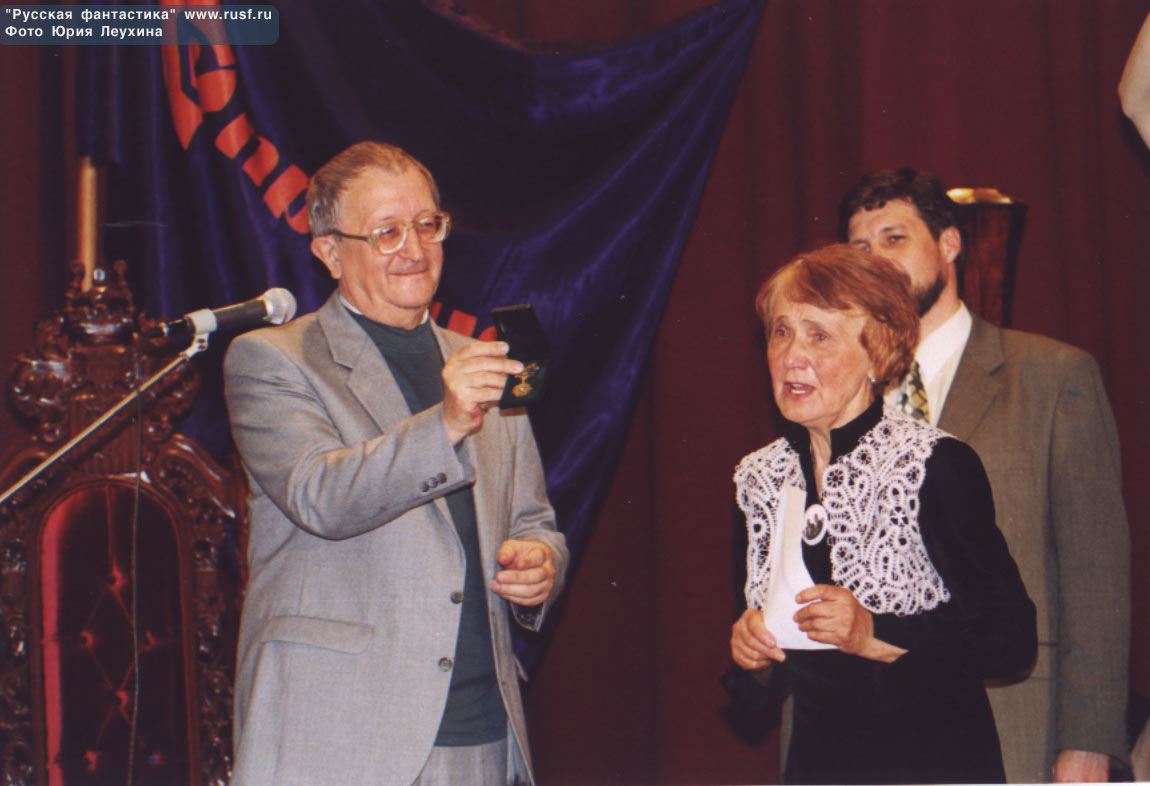'Анатолий Федорович был бы рад'. Клара Бритикова получает 'Семигранную гайку', присужденную покойному мужу. 'Лауреат и мэтр'. Вячеслав Рыбаков и Борис Стругацкий на встрече лауреатов и финалистов со спонсорами и меценатами.
