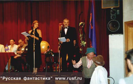 'Все мы выросли из Быковского спецкостюма...'. Член Оргкомитета Вячеслав Рыбаков объявляет о награждении Бориса Стругацкого 'Семигранной гайкой'. 'Где же этот Аничков мост?'. Член Оргкомитета Виталий Бабенко на фоне невской воды. 'Работайте, ребятушки, работайте!' Борис Стругацкий на троне.