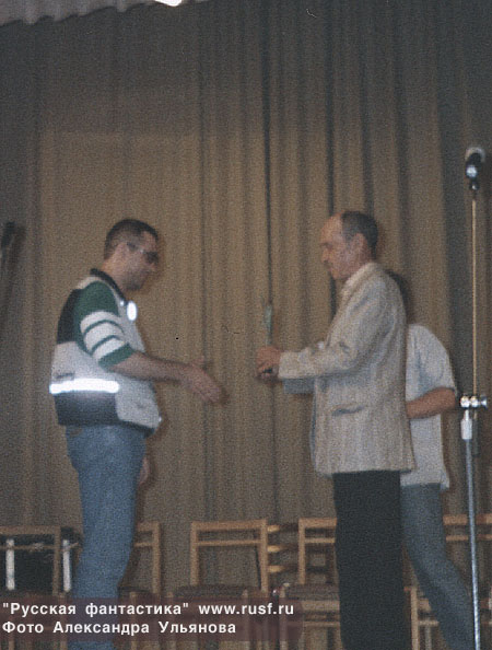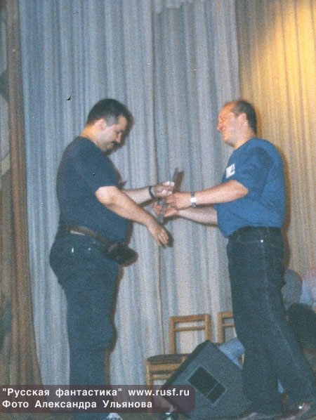 Михаил Успенский получает приз. А.Сидорович и Константин Фадеев. Сергей Лукьяненко и Юлий Буркин