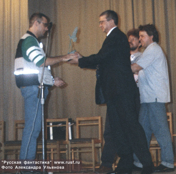 М.Успенский получает приз. А.Сидорович и Константин Фадеев. С.Лукьяненко и Ю.Буркин