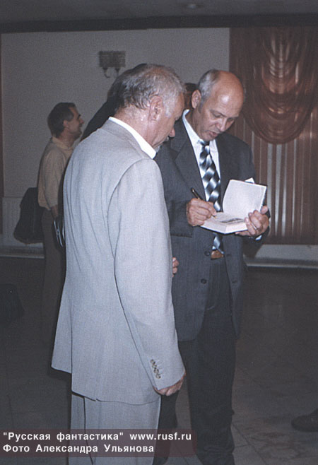 Там же Василий Головачев подписывает книгу. Василий Головачев подписывает другую книгу.