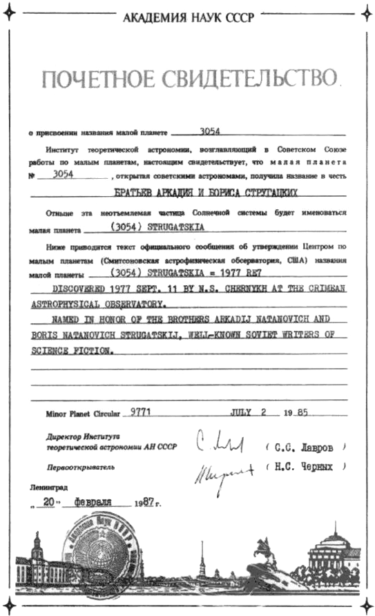 1985. The International centre of small planets (Cambridge, USA) in the special circular has ratified the name (3054) Strugatskia = 1977 RE 7 for a new small planet 3054 . The planet was found in September 11, 1977 by N.S. Tsernyh, an employee of