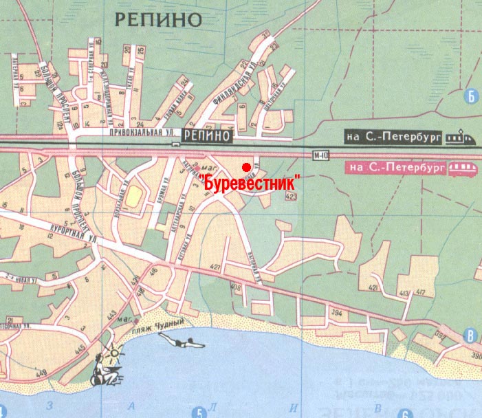 Ехать до станции Репино, далее пешком 500 метров. (Пансионат находится с левой стороны по ходу движения электропоезда из Петербурга).