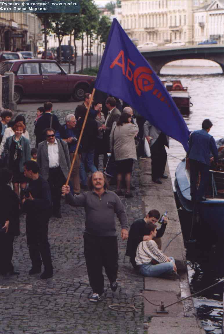 "А вот и Петропавловка". Катер с финалистами входит в Кронверкский пролив. "В ожидании катера". Слева направо - финалисты Вячеслав Рыбаков и Михаил Веллер и член Оргкомитета Андрей Измайлов в Белом зале ЦСЛиК. "Приплыли!". Святослав Логинов со знаменем "АБС-премии".