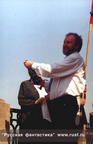 'Все мы выросли из Быковского спецкостюма...'. Член Оргкомитета Вячеслав Рыбаков объявляет о награждении Бориса Стругацкого 'Семигранной гайкой'. 'Где же этот Аничков мост?'. Член Оргкомитета Виталий Бабенко на фоне невской воды. 'Работайте, ребятушки, работайте!' Борис Стругацкий на троне.
