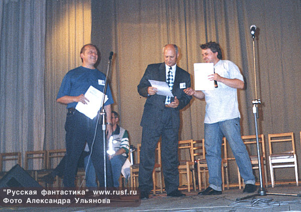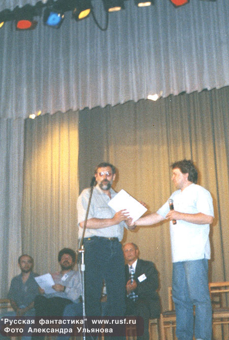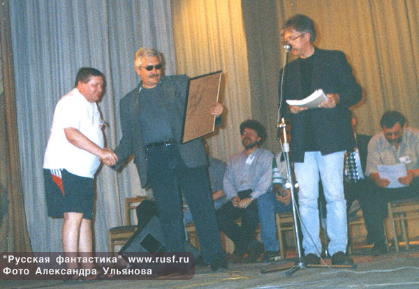 М.Успенский получает приз. А.Сидорович и Константин Фадеев. С.Лукьяненко и Ю.Буркин
